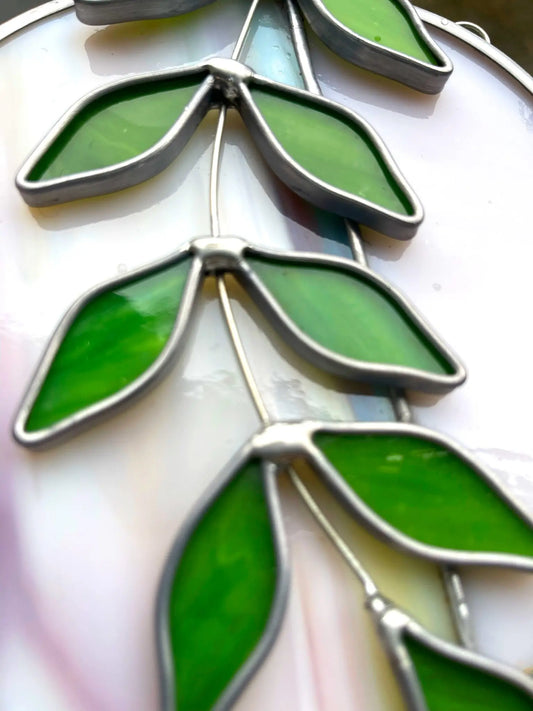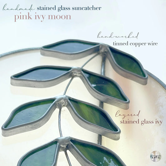 Handmade Full Moon Ivy Stained Glass Suncatcher, Pink and White