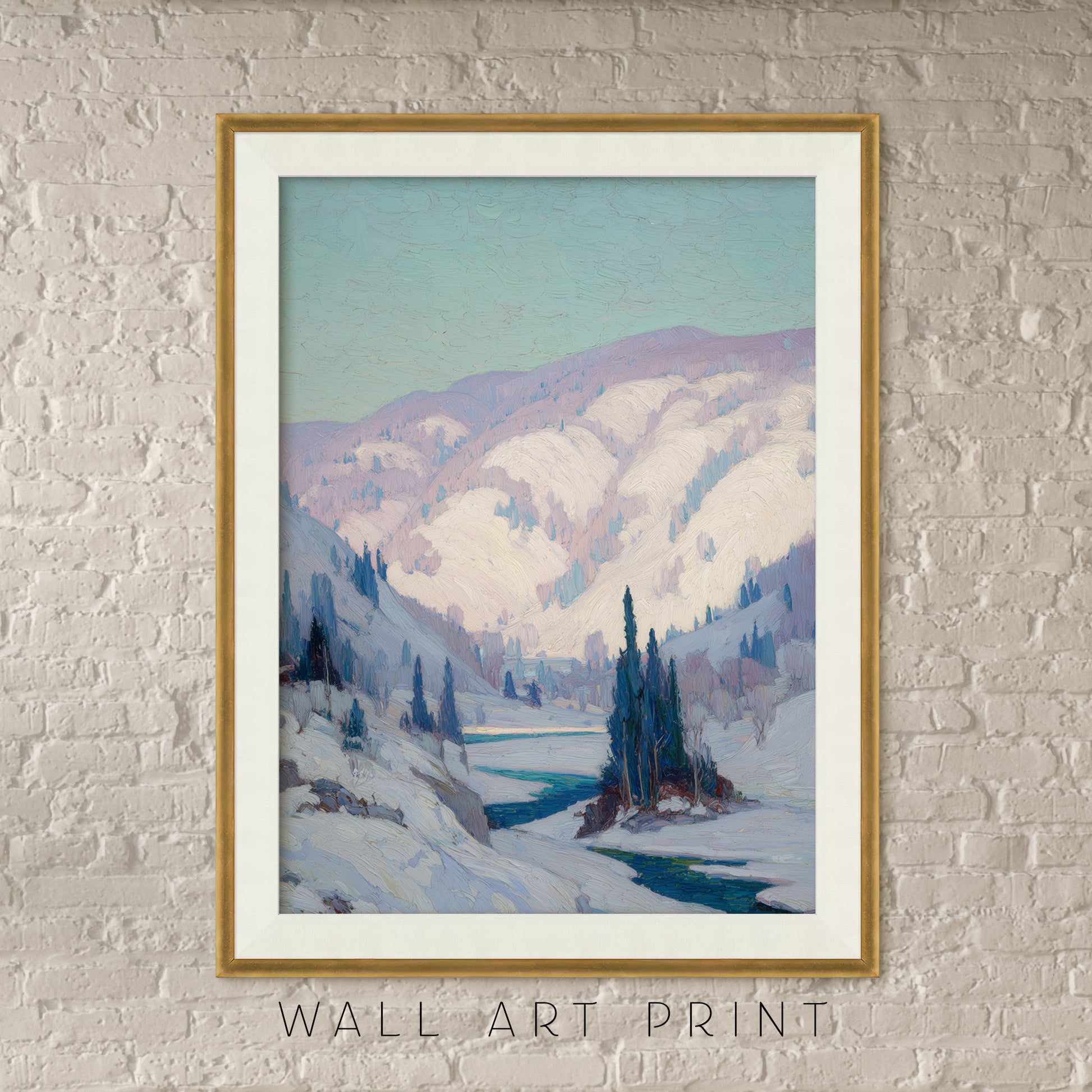 This First Creek landscape painting art print features a quiet creek in winter, with tall snow-covered hills, bright clear water, and a late afternoon sky. The brushstrokes are heavy and textured, with soft colors colors - white, purple, lavender, teal, and grey - used to recreate this famous rockhounding locality in Washington state.