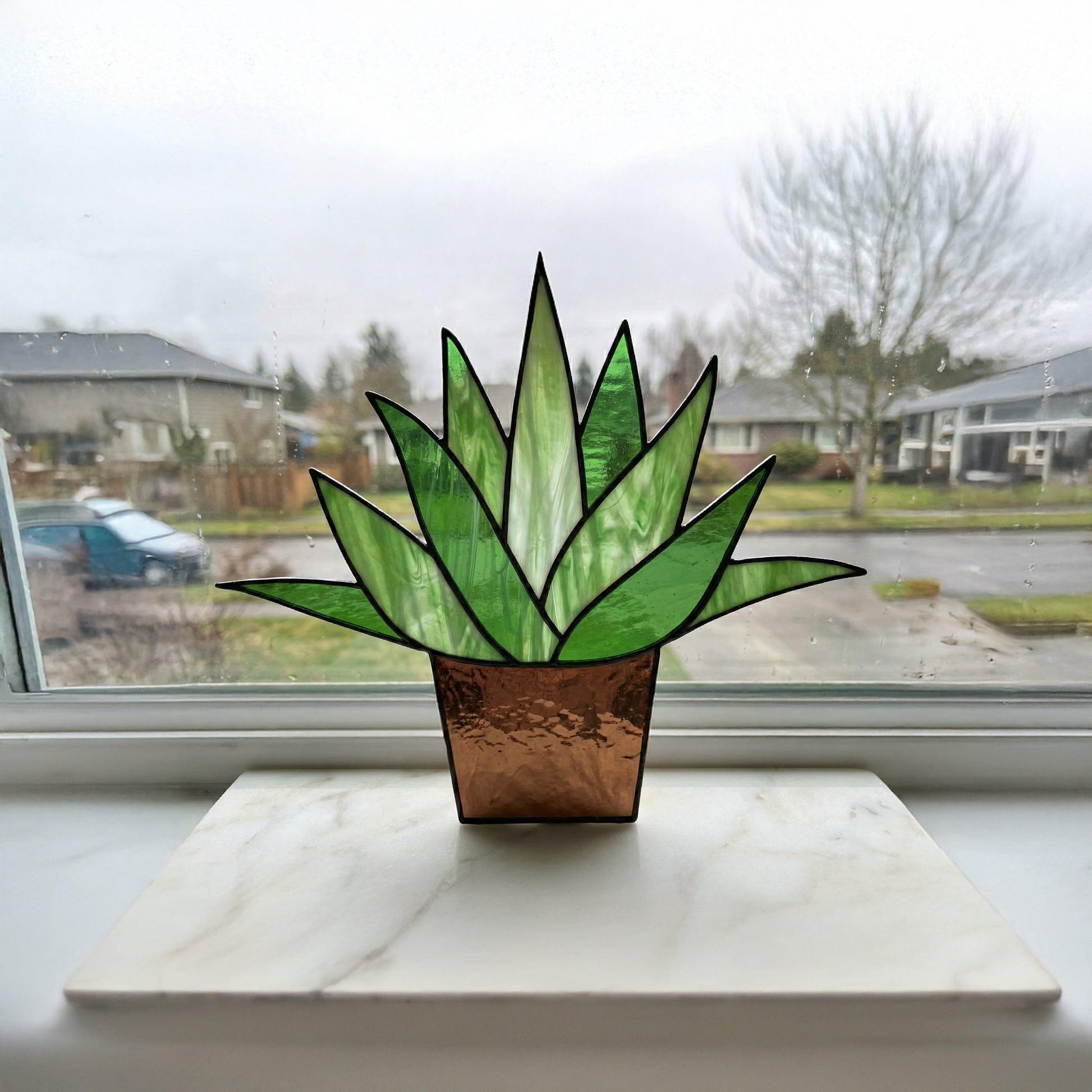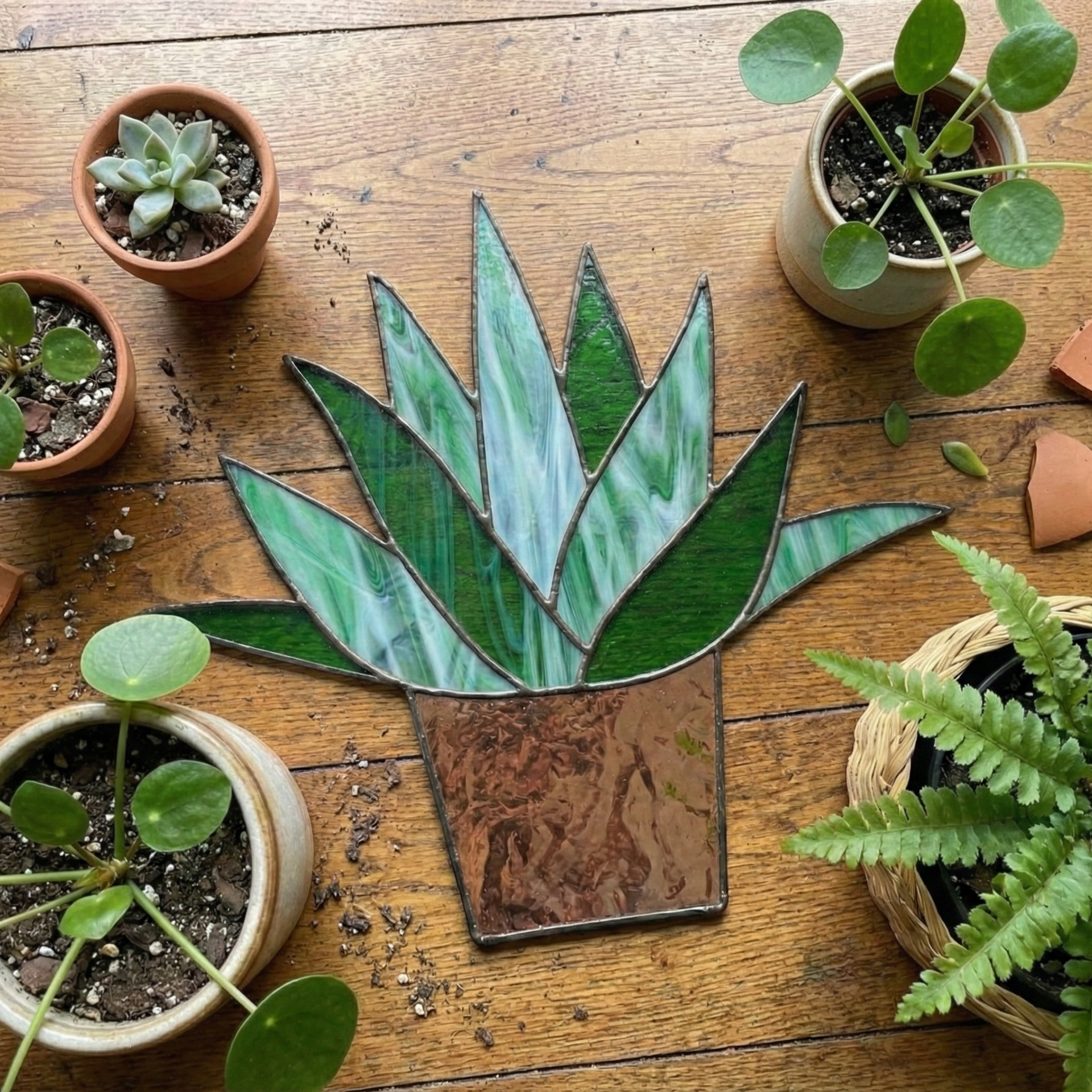 Make your own agave plant stained glass! This is a great pattern for a beginner stained glass artist - it requires only 10 pieces of brown and green stained glass to complete, so you can make your very own botanical glass artwork. It's one of many easy stained glass patterns on this website. This also includes a free PNG for use on your Cricut, Glowforge or other cutting machine.