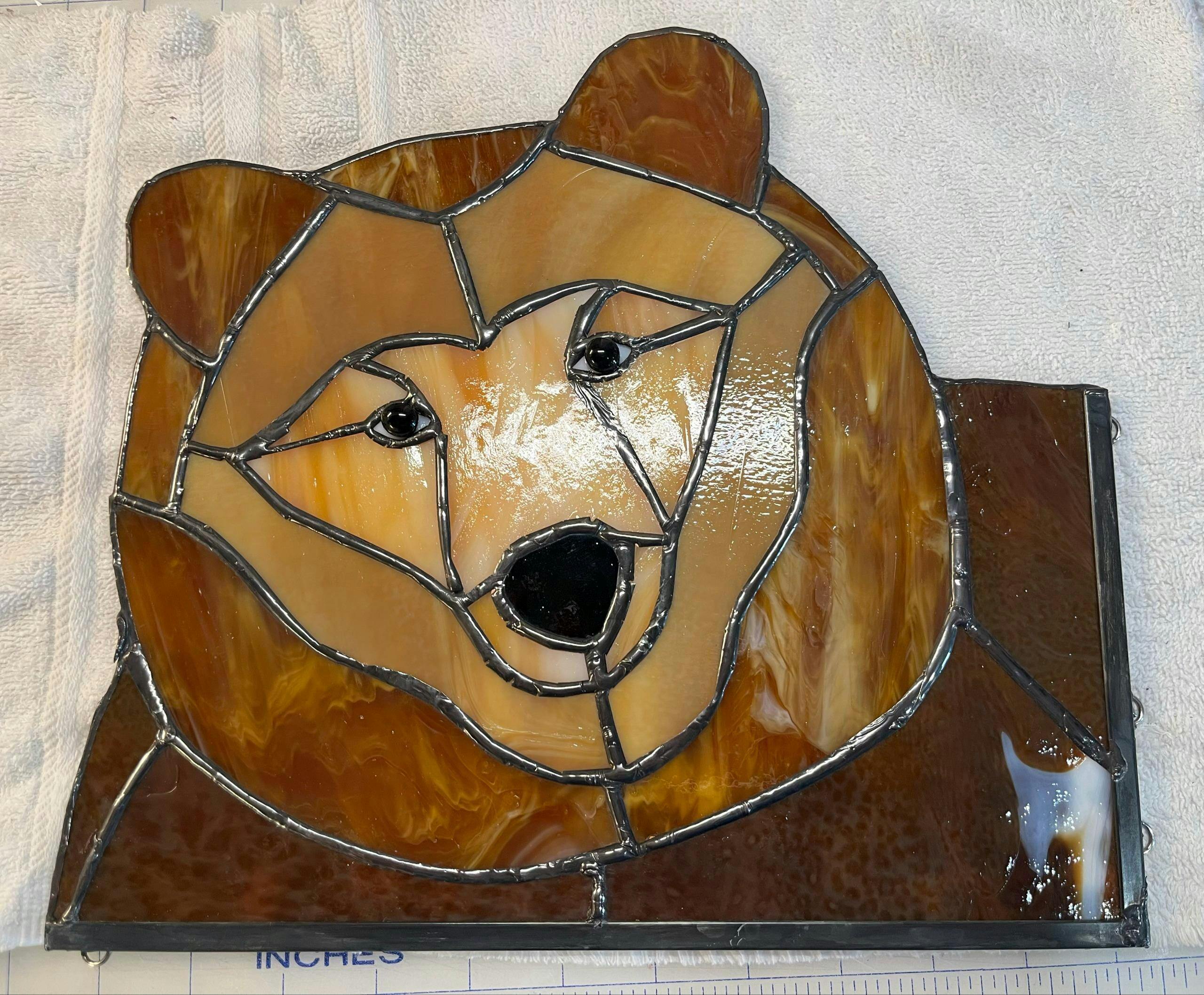 MATERIALS NEEDED: Glass, foiling tape, solder, the materials to solder them all together (flux, a soldering iron, etc.), hanging loops, and U-channel lead came. The came is important - the piece needs the structure of the came on the hanging sides. You can also use a bit of white glass paint to add highlights to the eyes. While there is a loop for "hanging" on the bottom of the piece, that is really there for stability - most of the weight of the piece will be held along the side of the piece.
