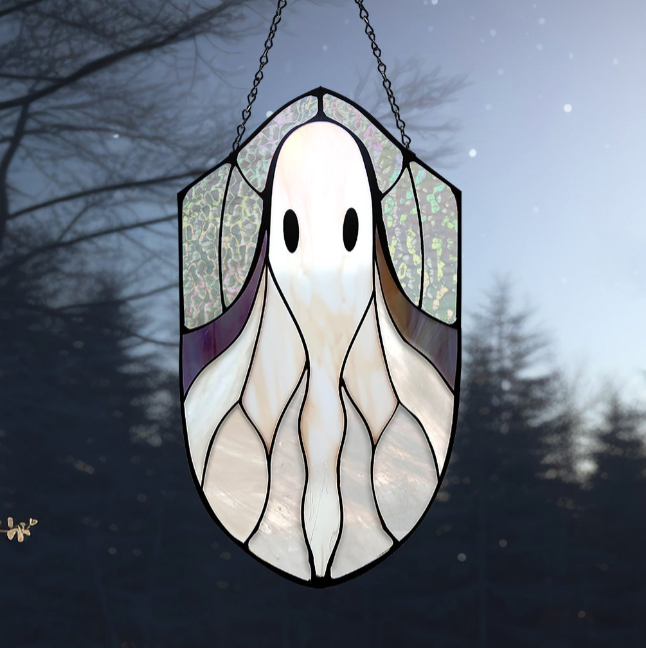 This boho ghost stained glass digital pattern download is ready to dress up your Halloween window.