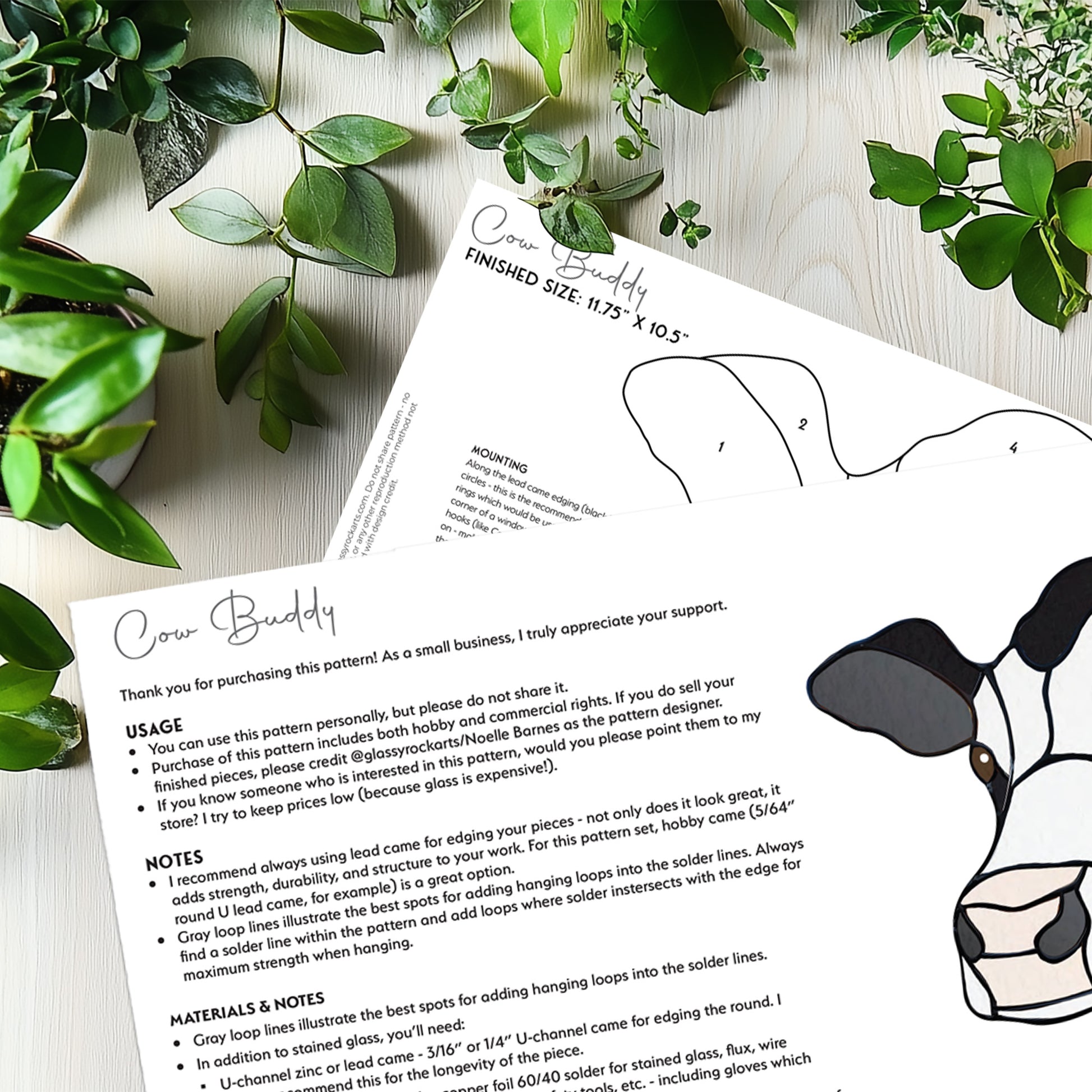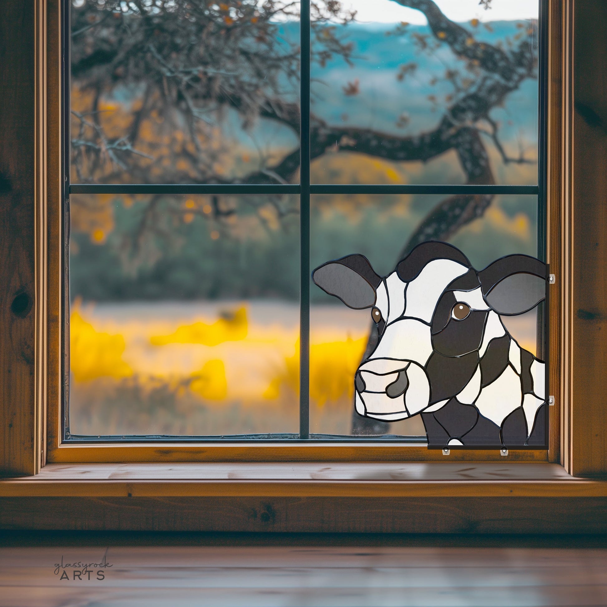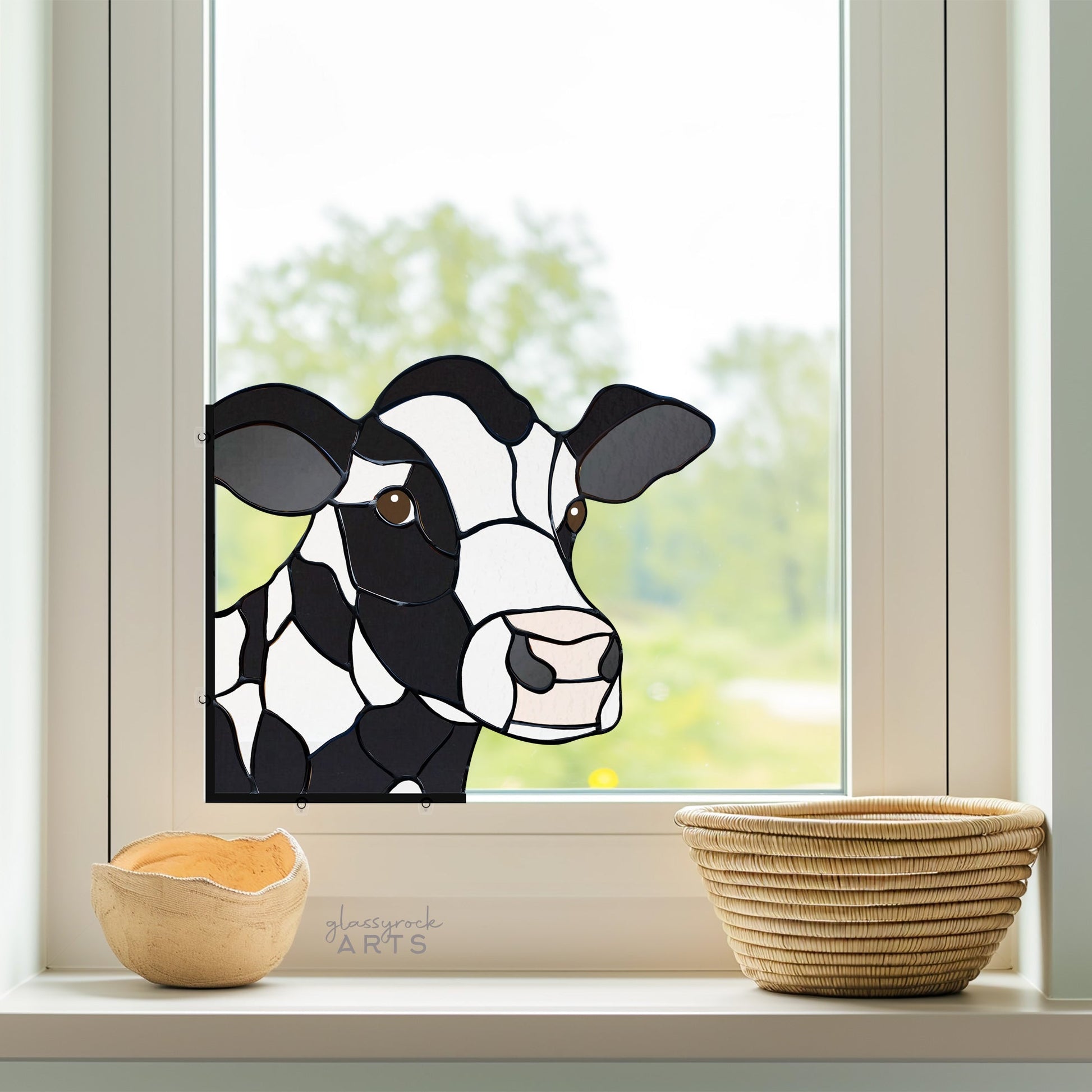 This adorable cow stained glass light catcher will pop up from the corner of a window frame and peek inside - the pattern is an instant download, ready for you to make. The cow suncatcher can be attached to the window frame with stick-on hooks, screws, or nails, depending on what your frame is made from.