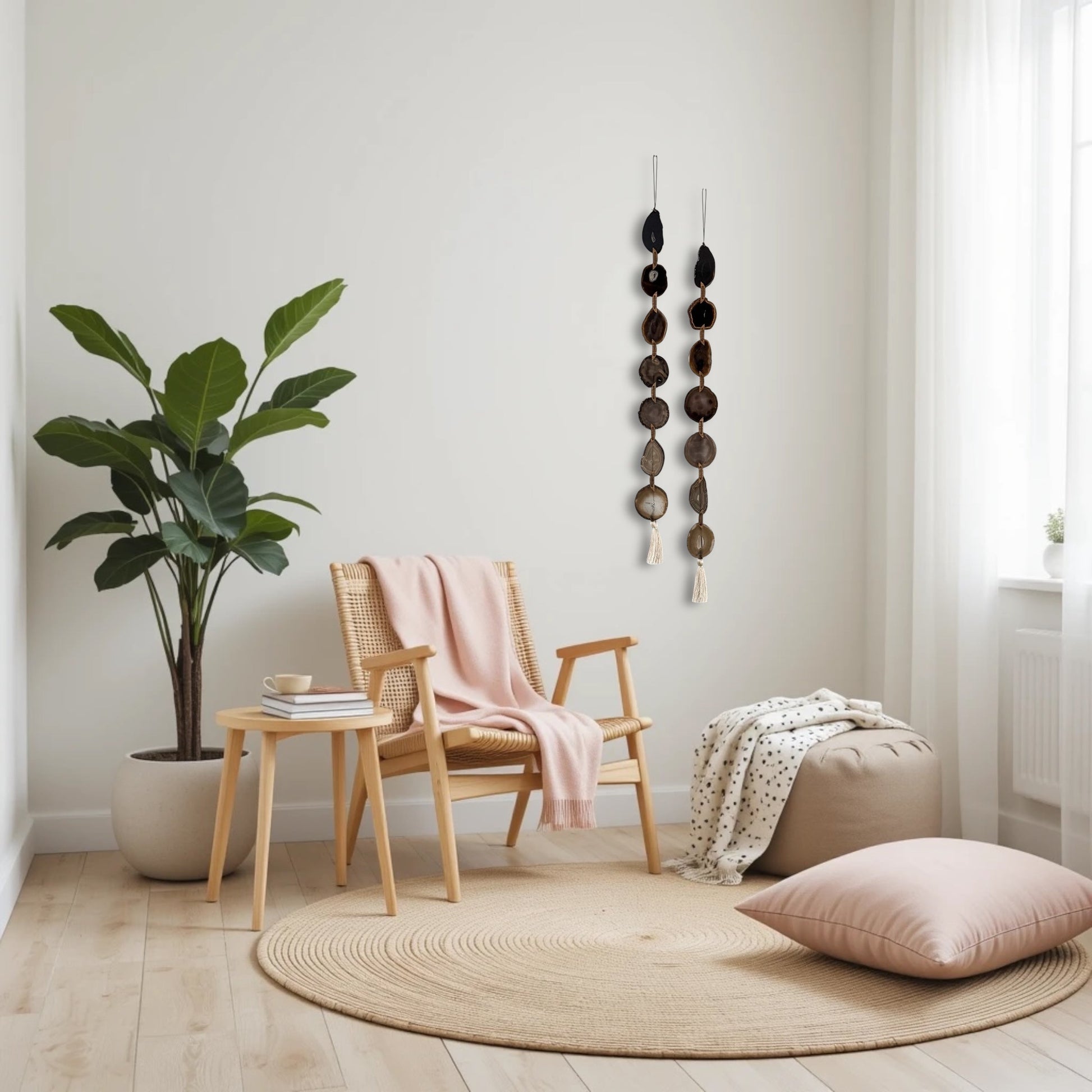 Designed to bring a sophisticated ombré gradient into your space, the Esme Agate Garland is a stunning 7-slice handcrafted piece that flows effortlessly from dark to light agate slices. Featuring a seamless transition of rich, deep tones to soft, airy neutrals, this design is crafted with leather cording, wooden half-moon accents, and a silk tassel in the customer’s choice of color. This versatile piece is the perfect blend of modern elegance and natural beauty.