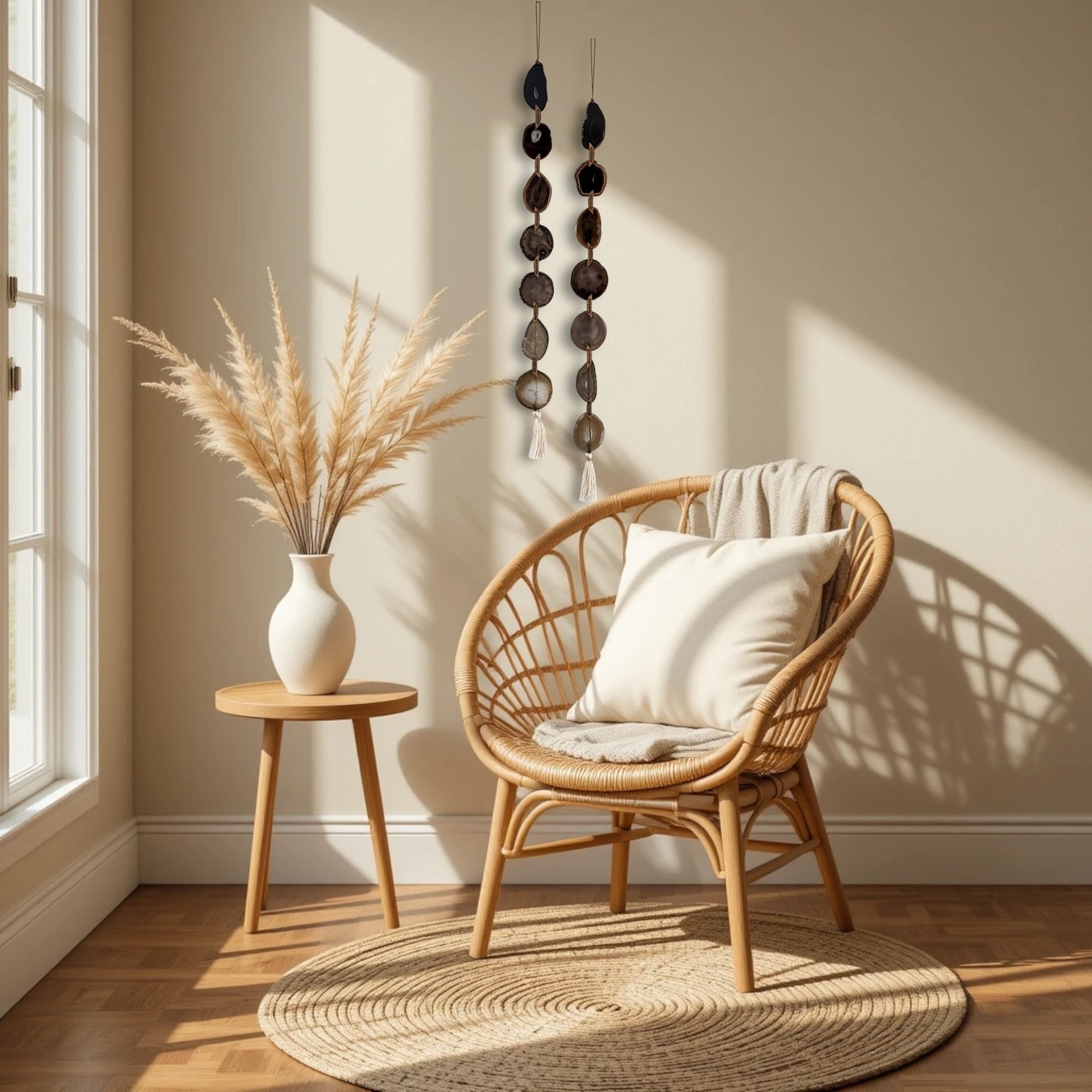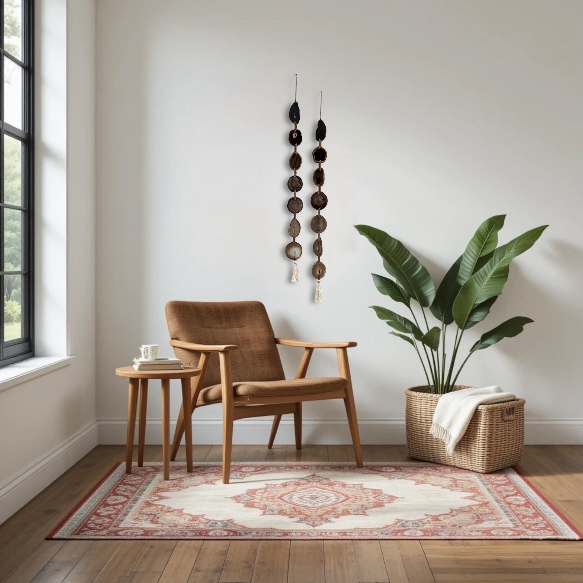 The Esme Agate Garland was created for those who appreciate subtle shifts in tone and seamless transitions in color. Inspired by sunset horizons, shifting landscapes, and the natural gradient of gemstones, this garland is a timeless addition to boho, modern, and minimalist spaces. Whether displayed in a gallery wall, above a mantel, or as a soft focal point in a bedroom or nursery, this piece enhances interiors with graceful movement and refined contrast.