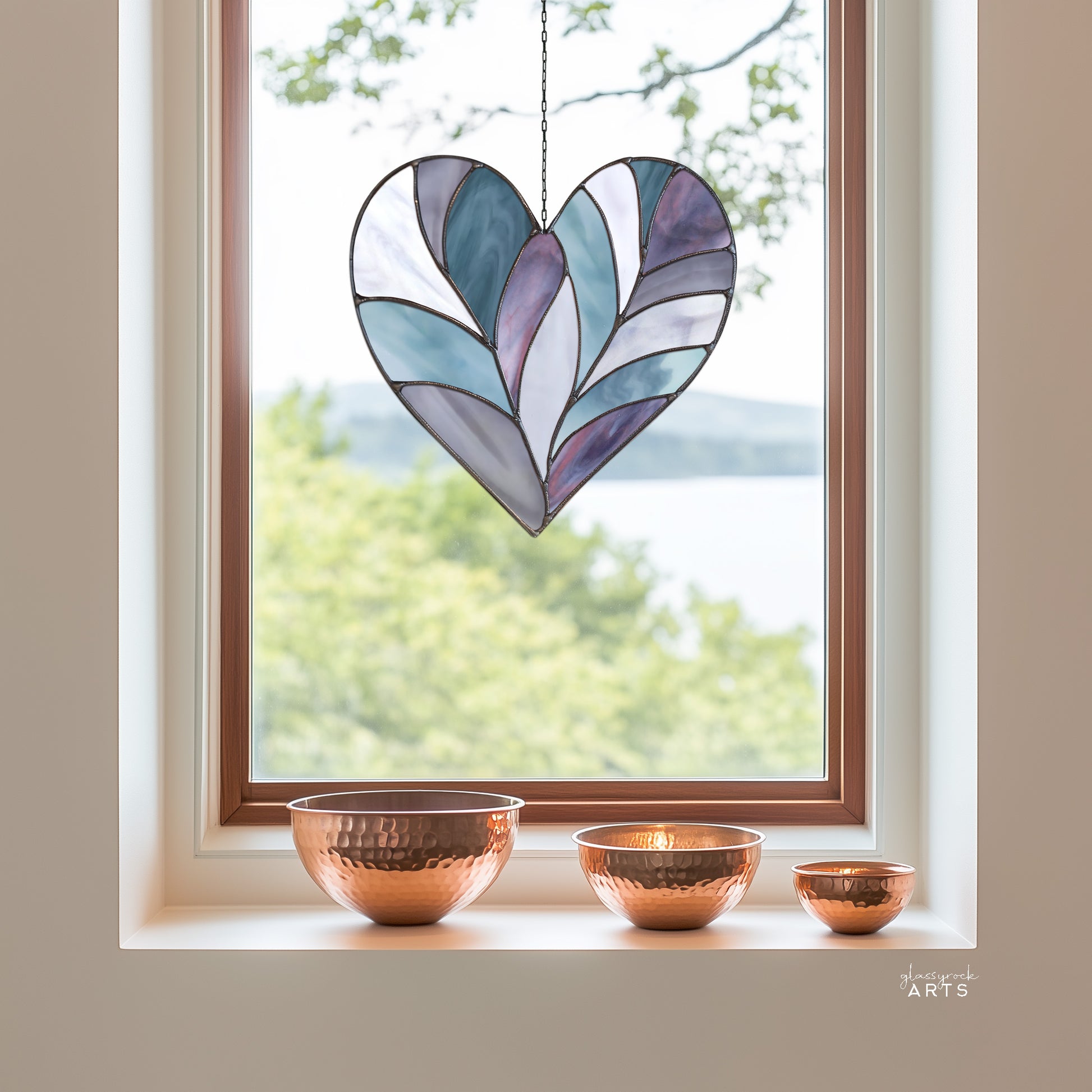 This is a digital download stained glass pattern for a feather heart sun catcher. It contains three pages - instructions and tips, a numbered version, and a clean version. The pattern prints out on letter-sized or A4 paper, and the finished piece will measure 8" x 8".