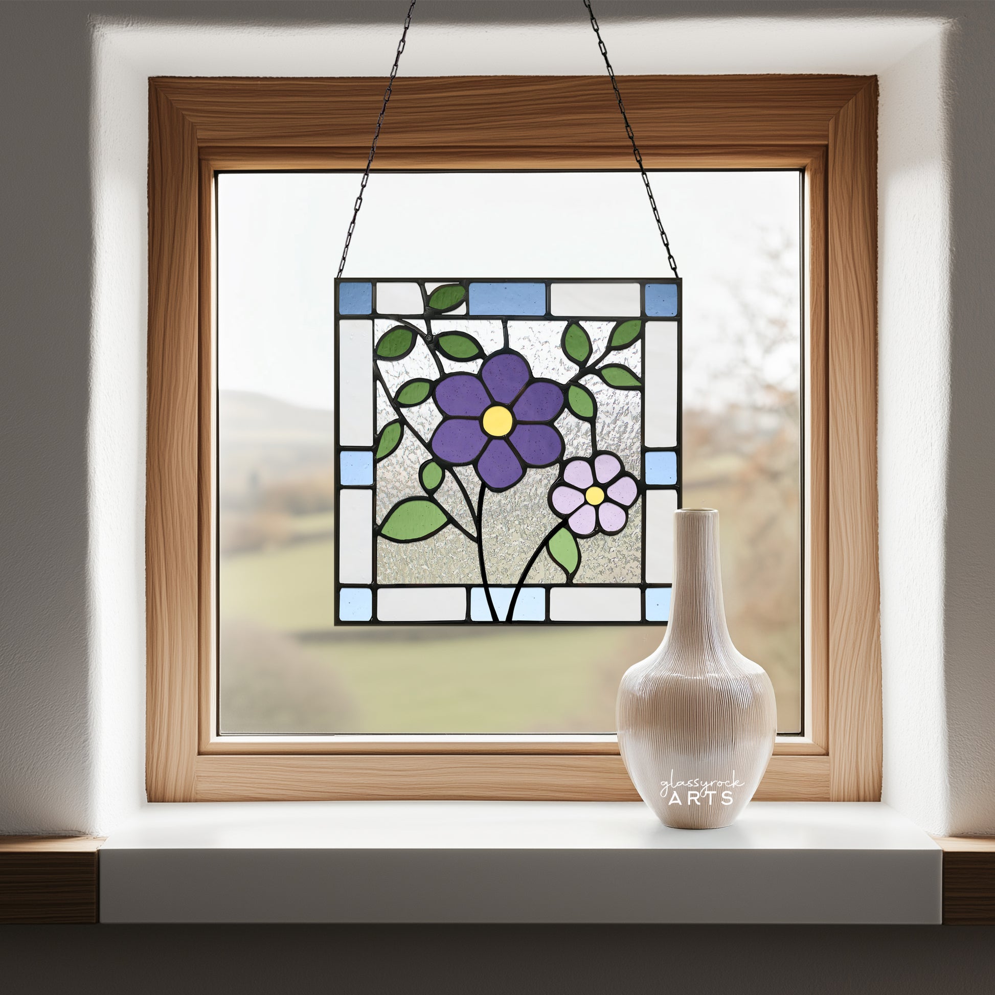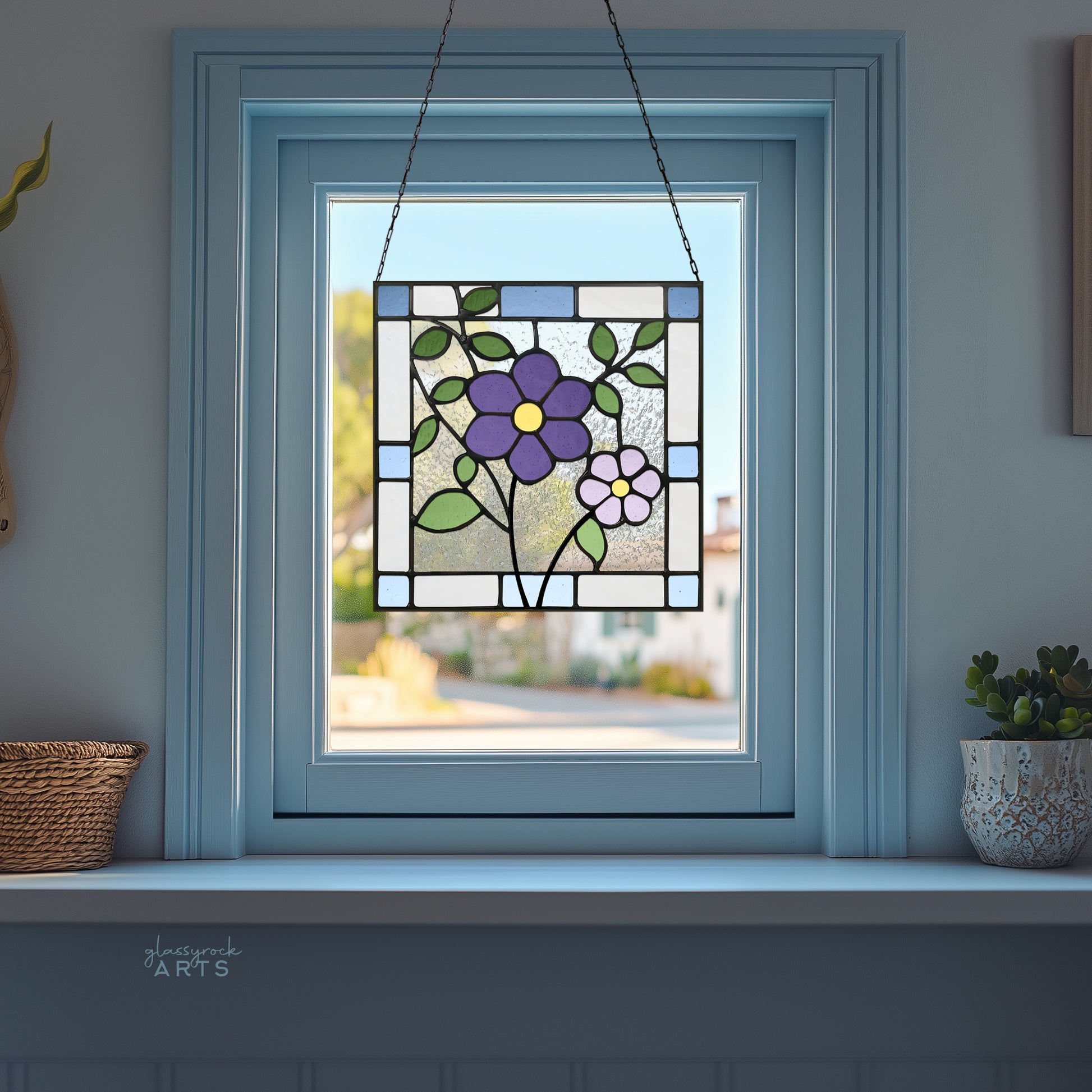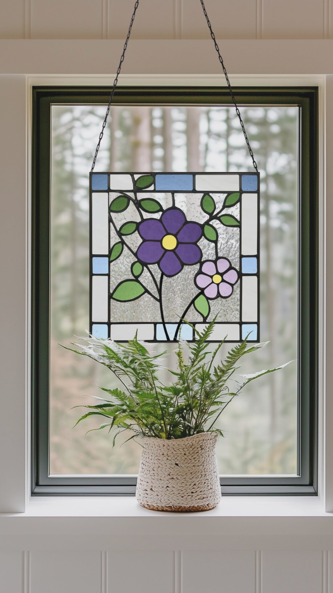 Make a beautiful stained glass flower panel with this printable square stained glass design. With this floral digital pattern, you can download this stained glass flower design instantly for a diy stained glass suncatcher! It contains three pages - instructions and tips, a numbered version, and a clean version. The pattern prints out on tabloid-sized or A3 paper, and the finished piece will measure 10" x 10".