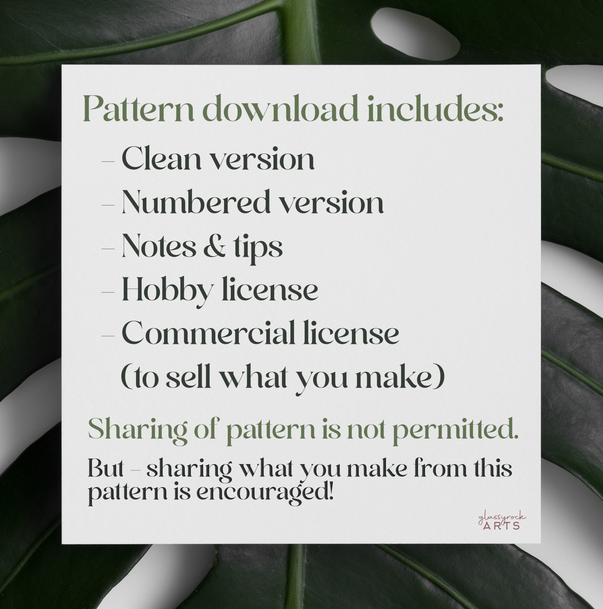 LICENSING: This download includes both a hobby and commercial license. Patterns cannot be reproduced, published (other than printing for personal use), or shared. If you do sell your finished work, please give a credit to Noelle Barnes/GlassyRock Arts as the designer.