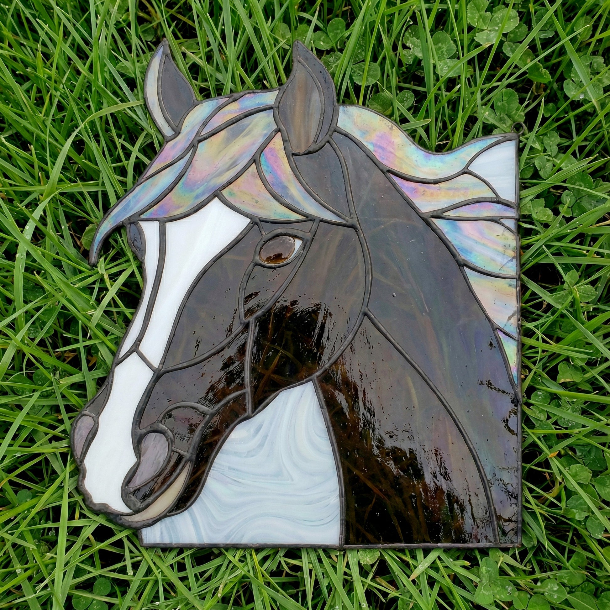 This horse stained glass pattern makes a great horse sun catcher gift that will pop up from the corner of a window frame and sweetly peek inside. This is a horse design digital download to make a horse suncatcher that sits in a corner. This stain glass horse can be attached to the window frame with stick-on hooks, screws, or nails, depending on what your frame is made from. Once completed, this piece measures 9.5” wide and 11” tall as printed on 11x17” tabloid-sized paper or A3 paper.