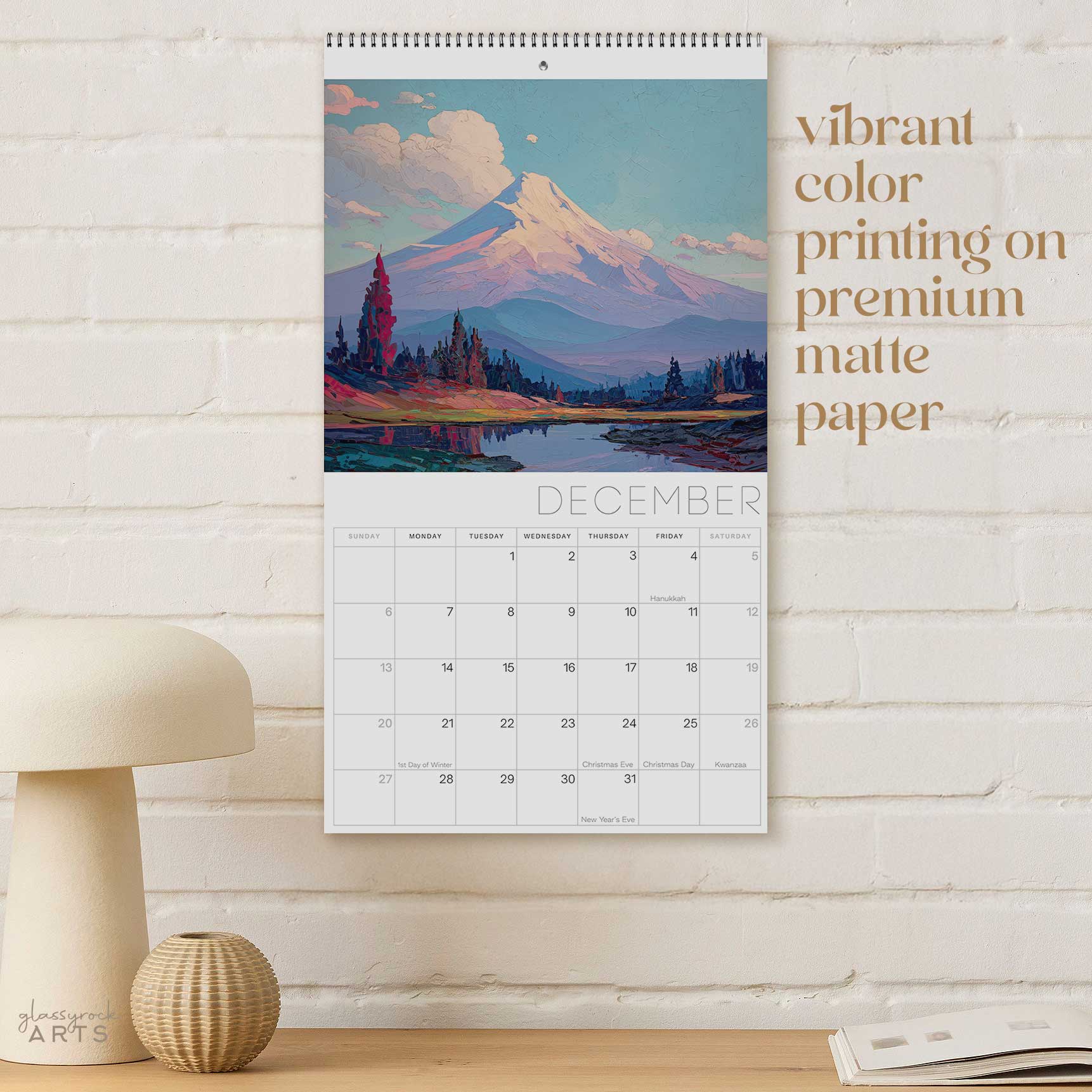 Each page includes a detailed mountain scene designed in a painterly, impressionist style. Bound with black twin-loop wire and ready to hang with a centered hole near the top. Sized for narrow wall spaces, hallways, offices, or anywhere you want a mountain moment.