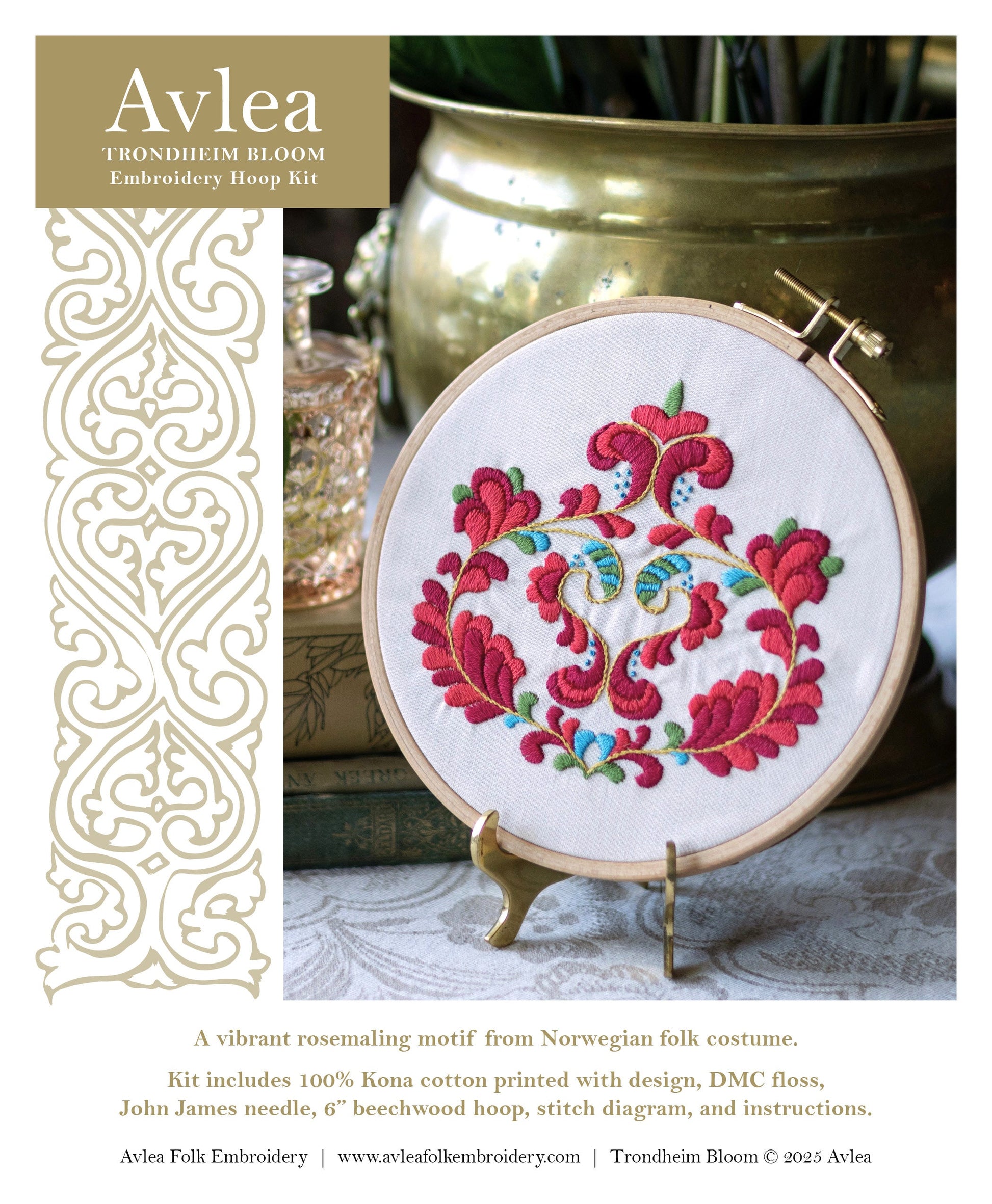 The Trondheim Bloom embroidery hoop kit is inspired by rosemaling embroidery motifs used in Norwegian folk costume. Stitched in a traditional bright color palette, it's a lovely introduction to Scandinavian folk embroidery. My high quality kits include the design printed on 100% Kona cotton, DMC 100% cotton embroidery floss, John James size 7 embroidery needle, how to embroider instruction booklet, stitch diagram, felt for backing, and 6' beechwood embroidery hoop.