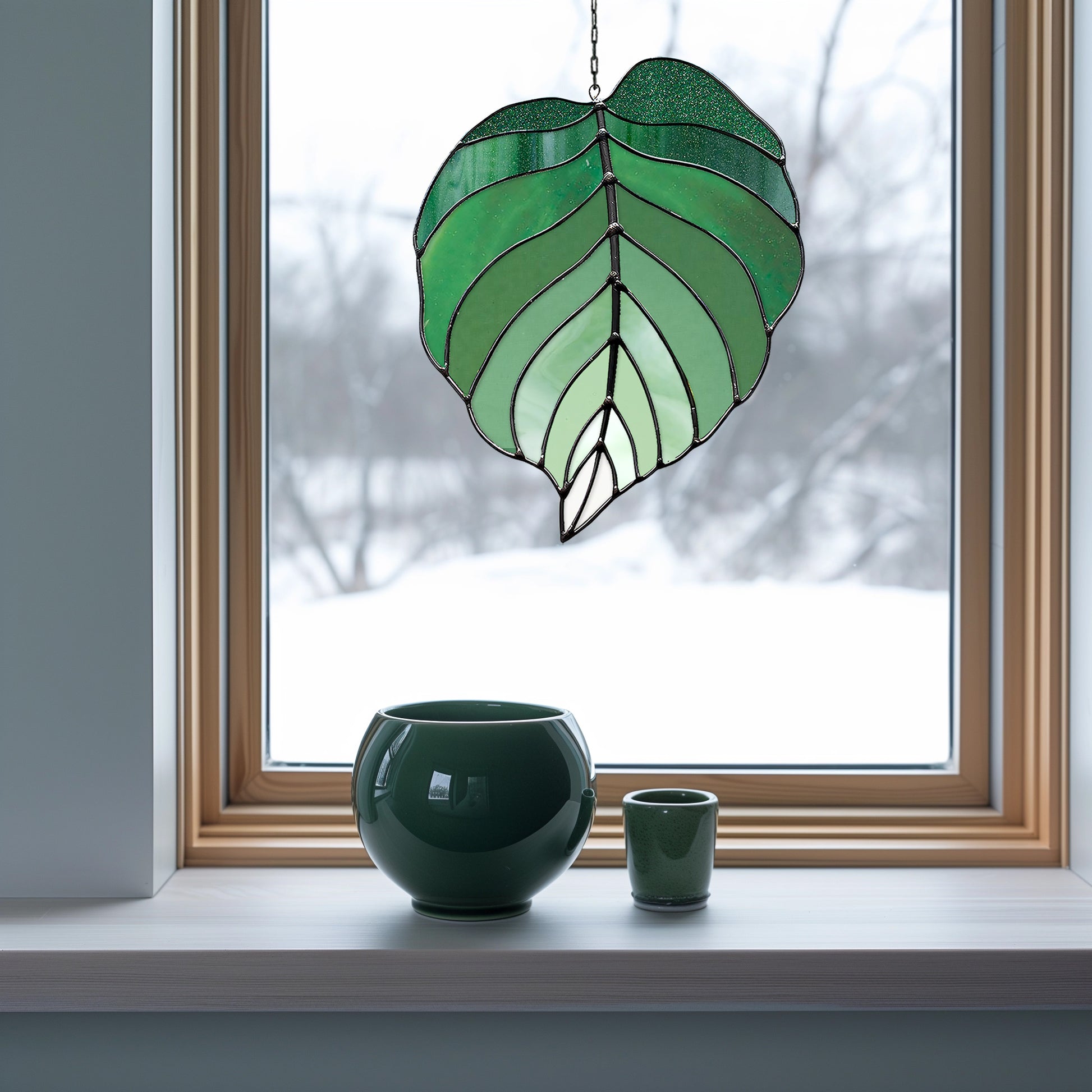 A lovely leaf stained glass light catcher for your window! This giant leaf stained glass suncatcher makes a great gift for a plant lover. The leaf suncatcher pattern is an instant download, a copper foil pattern for stained glass leaf art. It will print out on tabloid-sized, 11x17" paper.
