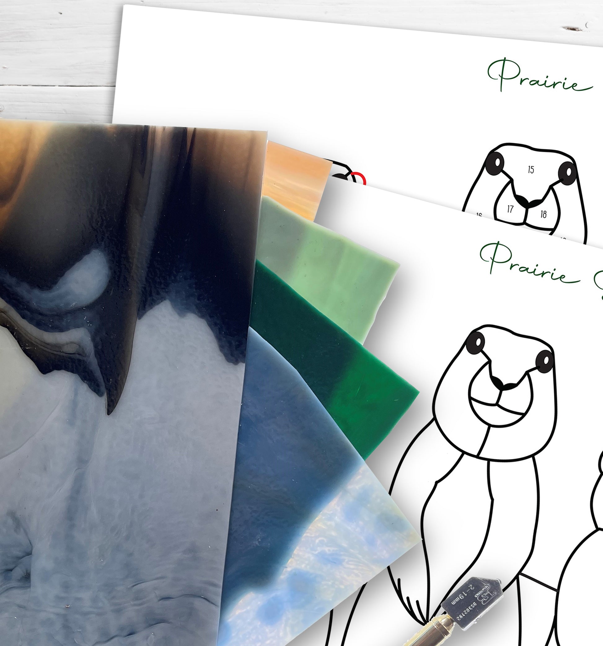 MATERIALS NEEDED: Glass, foiling tape, solder, the materials to solder them all together (flux, a soldering iron, etc.), hanging loops, and U-channel lead came. The came is important - the piece needs the structure of the came on the hanging side. You can also use a bit of white glass paint to add highlights to the eyes and nose. You'll also need hanging chain or string if you want to hang it without using the corner of a windowsill. Instructions are included.
