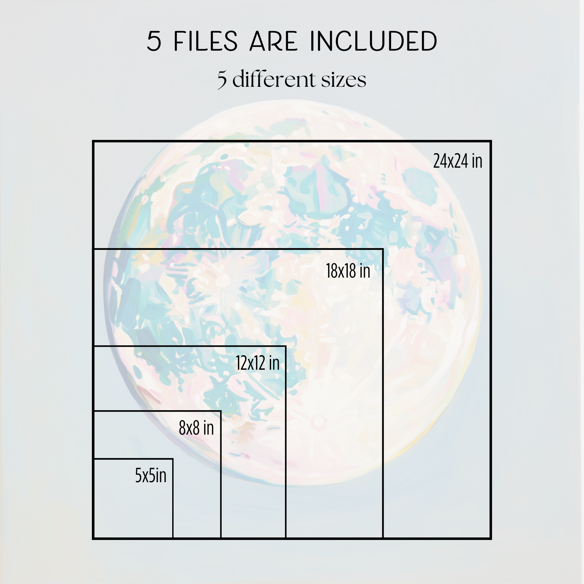You'll receive five high-resolution JPG files in the most common aspect ratios, making it easy to find the perfect fit for your frame or wall space. Each file is 300 dpi and sized to print up to 24 inches on the longest side for crisp, detailed results (except where indicated to be less, such as 11x14).