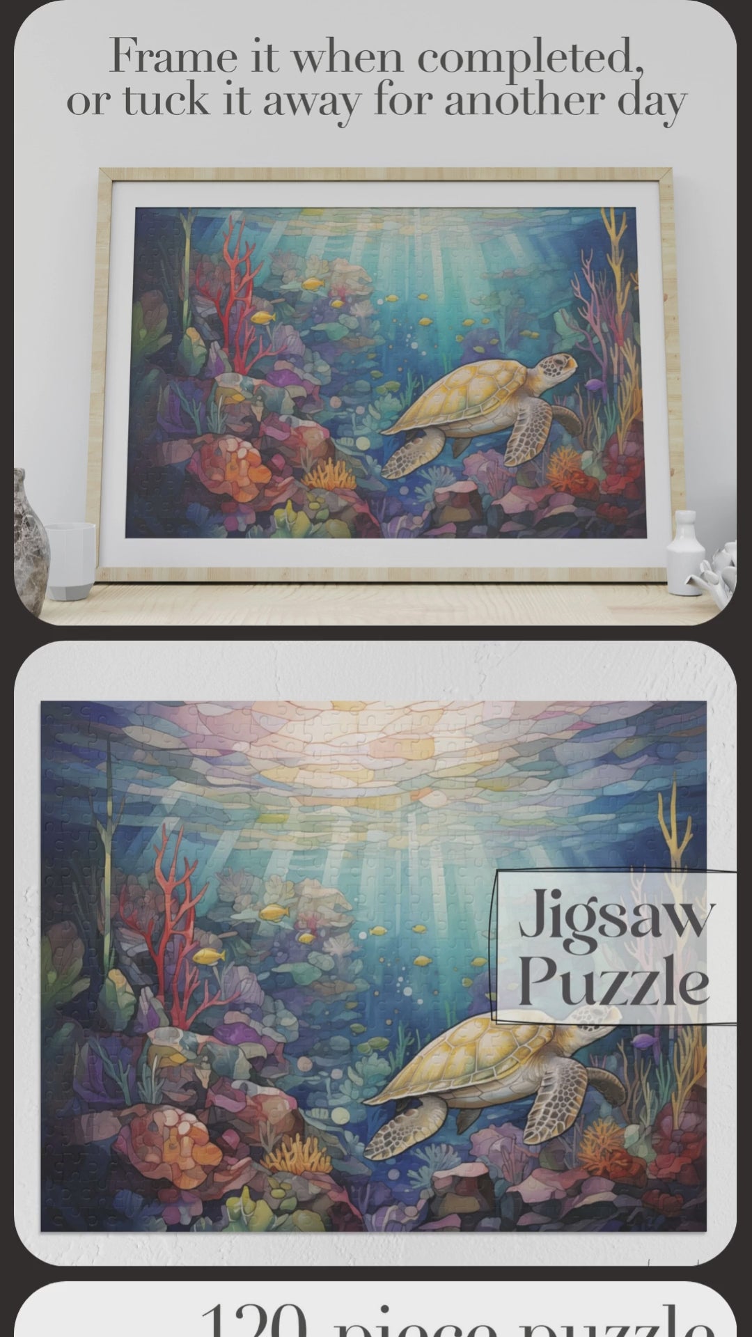 This artist-designed sea turtle reef jigsaw puzzle makes a perfect stained glass gift, a great turtle art gift, and a gift for a couple. Gorgeously printed on high-quality chipboard pieces, this puzzle is available in 120, 252, and 500-piece sizes. Each puzzle arrives in a gift-ready box with the puzzle image on the top, making it a great gift for a puzzle lover!