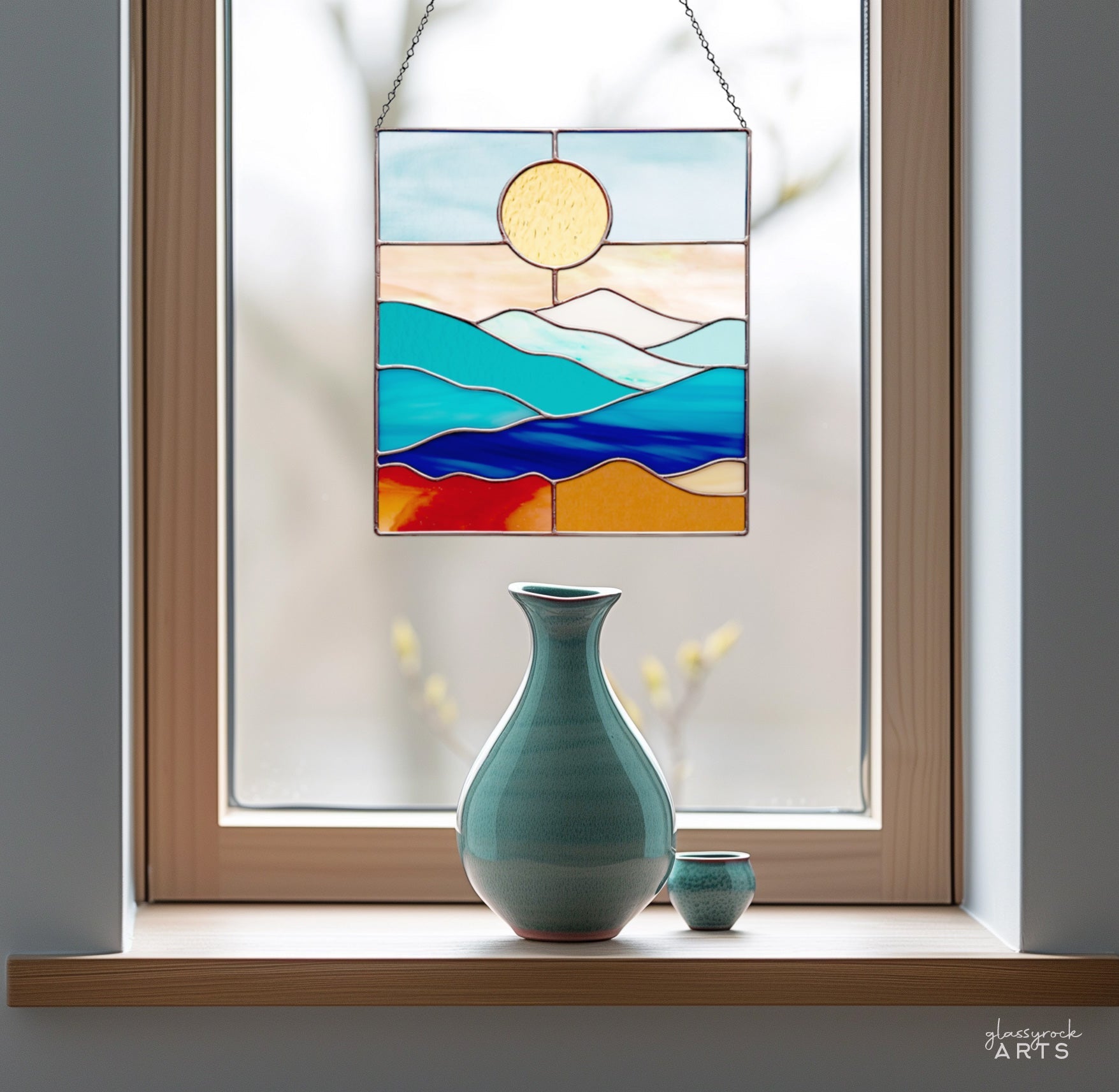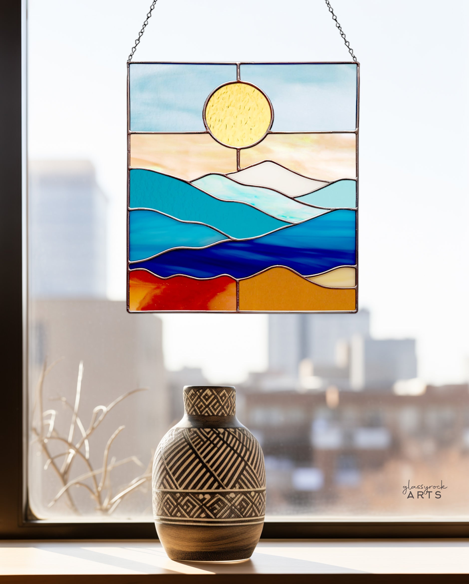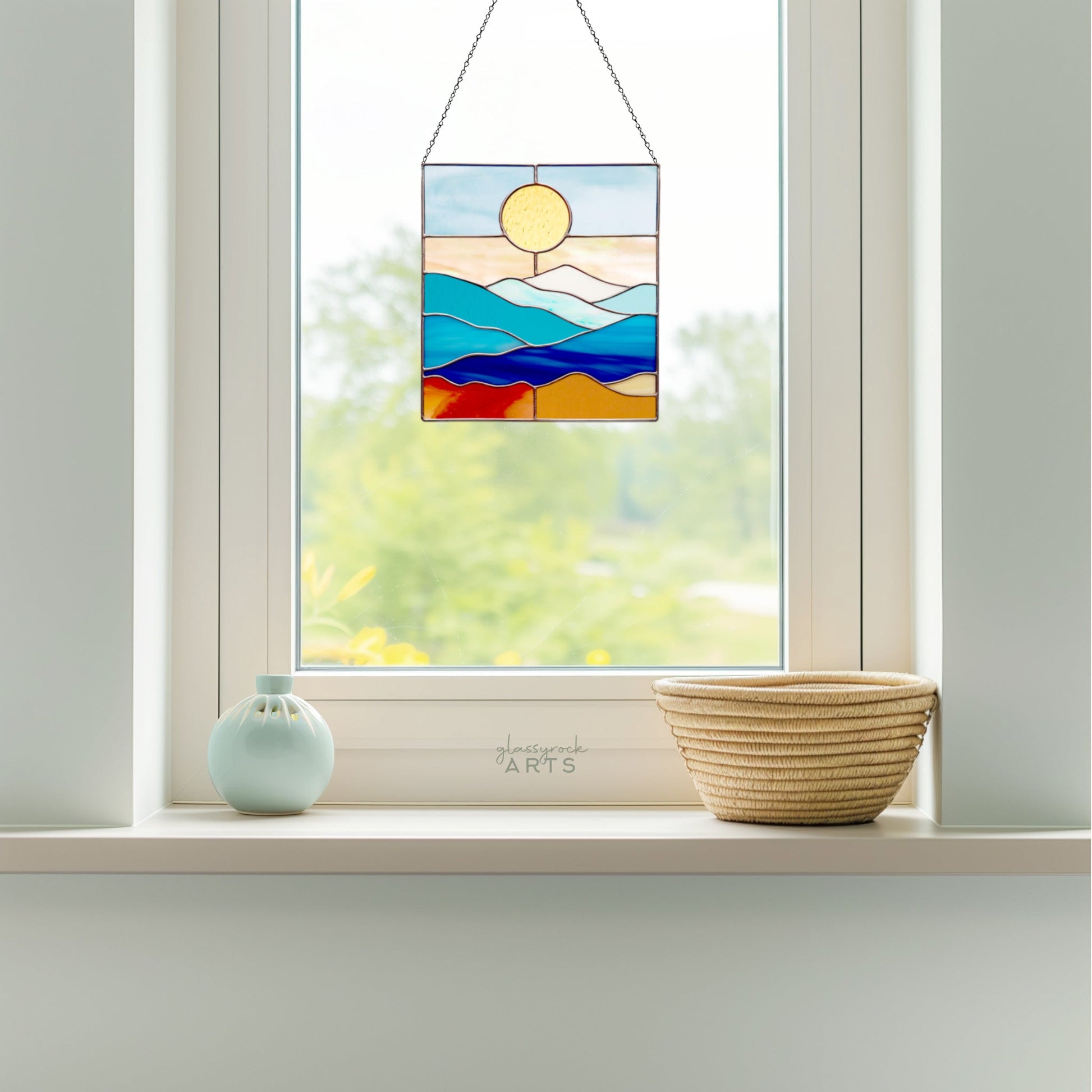 This smoky mountains stained glass landscape pattern measures 8" wide by 8.25" tall. It's a printable digital download, and will make beautiful stain glass sun catchers for a window or a lovely wall hanging.Â