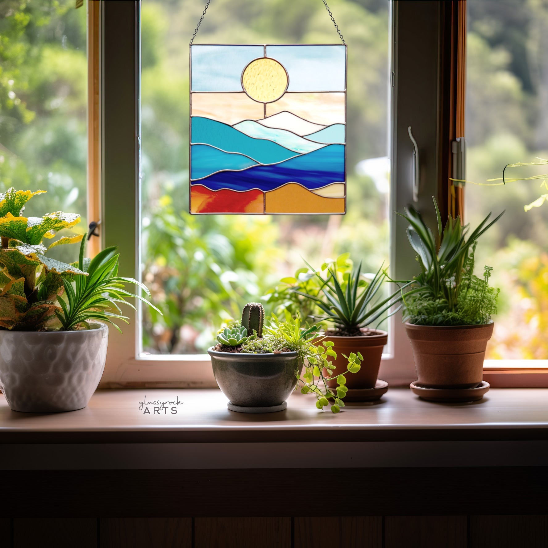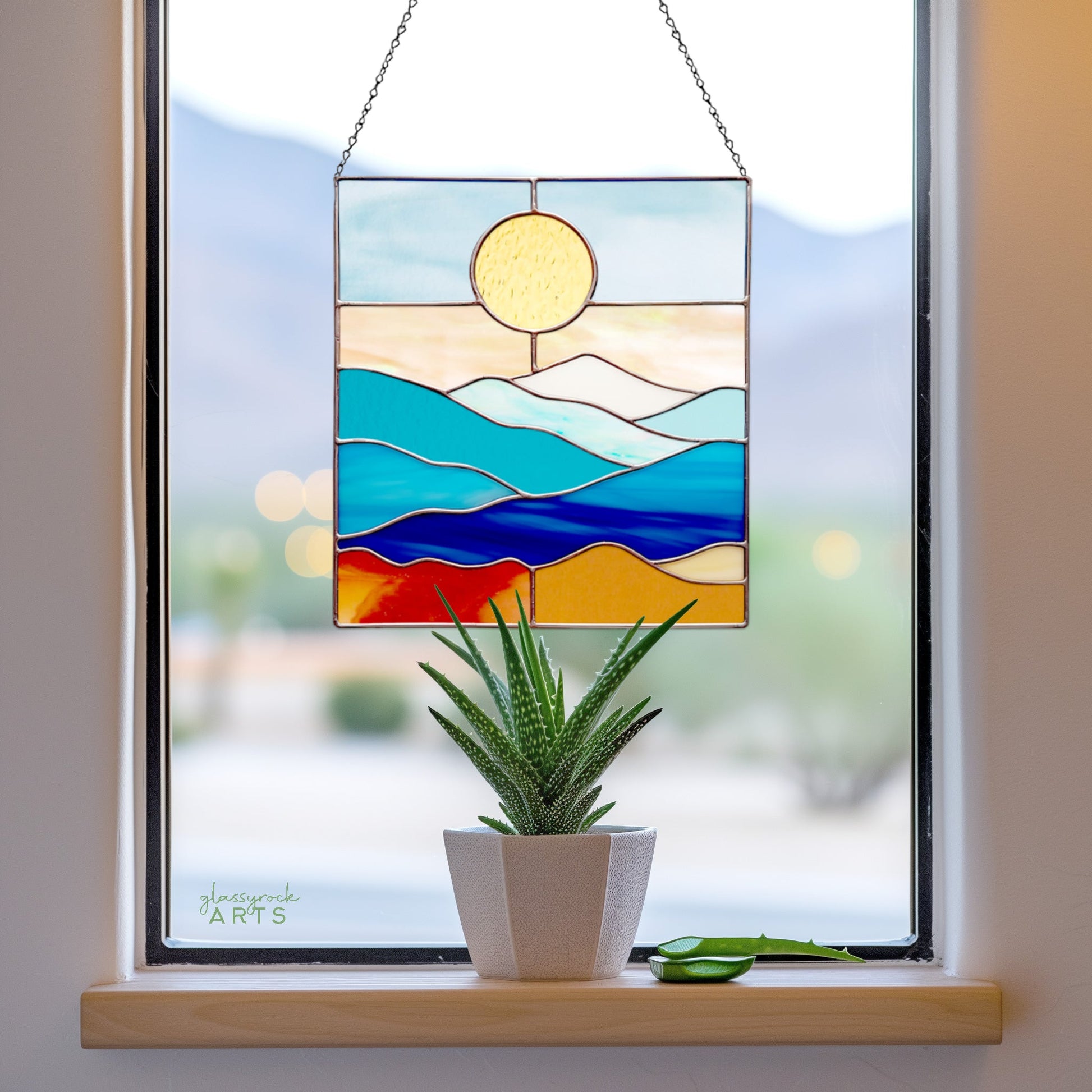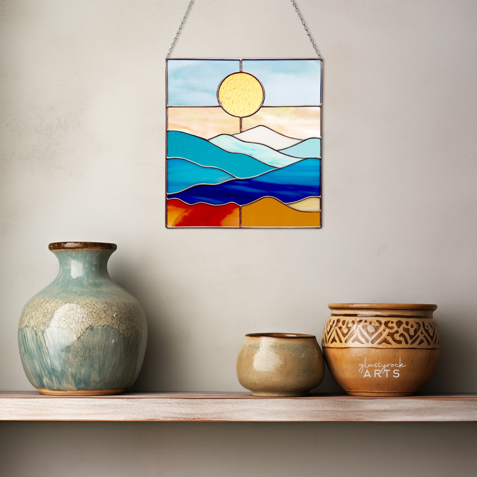 This smoky mountains stained glass landscape pattern measures 8" wide by 8.25" tall. It's a printable digital download, and will make beautiful stain glass sun catchers for a window or a lovely wall hanging.Â