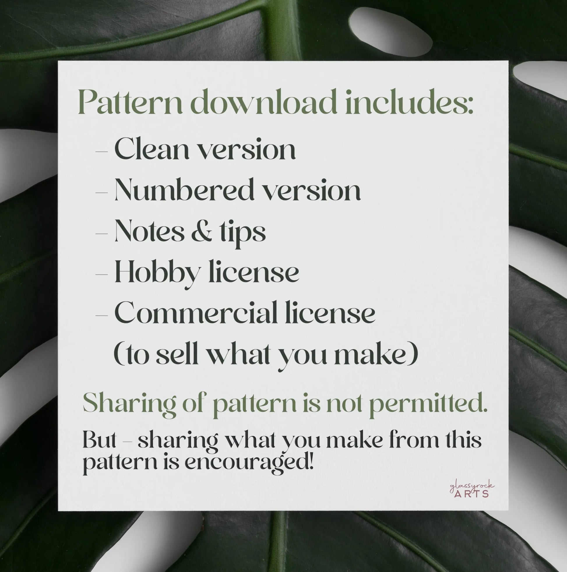 𝐋𝐈𝐂𝐄𝐍𝐒𝐈𝐍𝐆: This download includes both a hobby and commercial license. Patterns cannot be reproduced, published (other than printing for personal use), or shared. If you do sell your finished work, please give a credit to Noelle Barnes/GlassyRock Arts as the designer.
