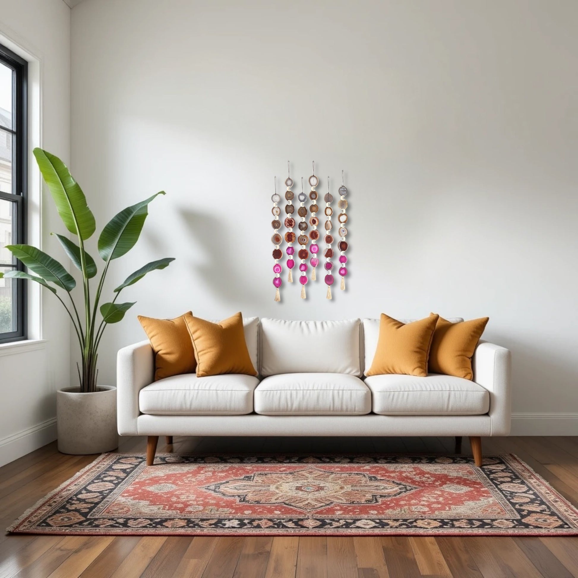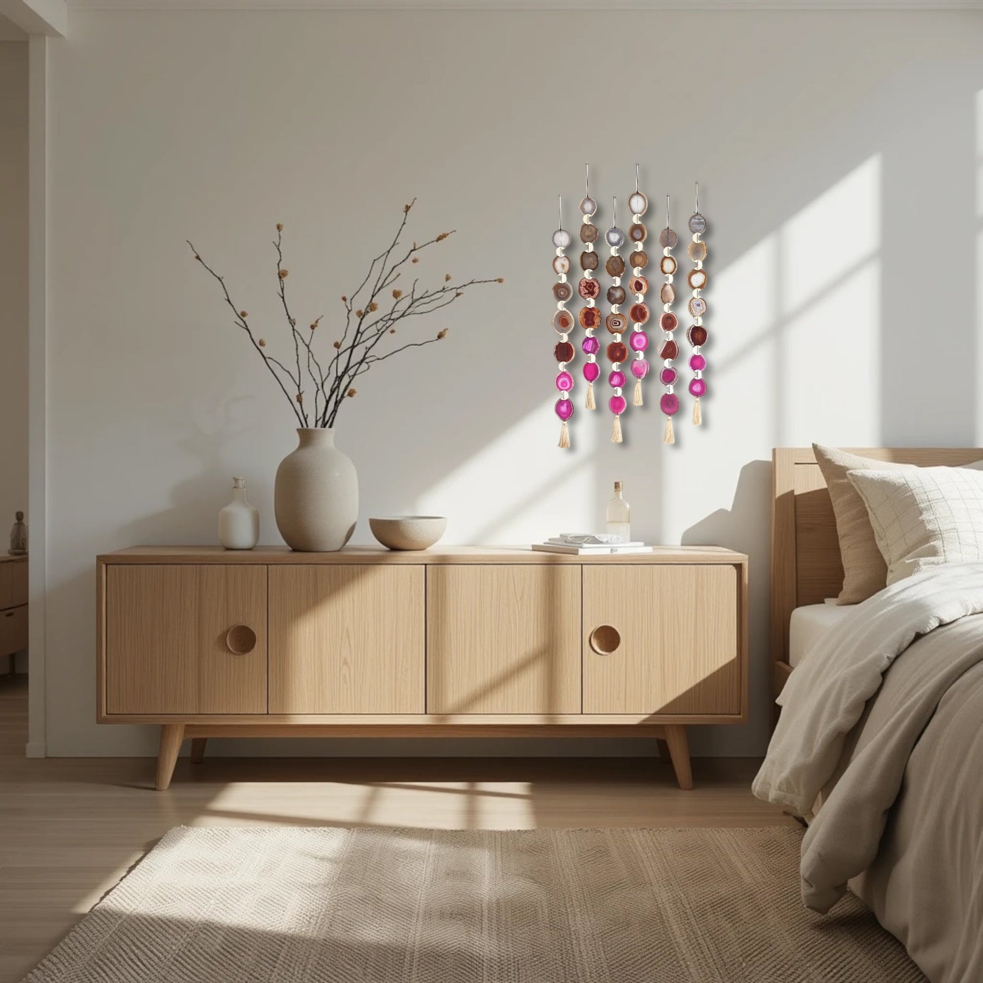 There’s something magical about a summer sunset—the way the sky shifts from golden amber to deep magenta, fading into warm, rich tones. The Sunset Agate Garland was created to capture this fleeting beauty in a timeless, handcrafted piece. Whether styled in a cozy living space, bedroom, or creative studio, this garland radiates warmth and an organic, bohemian elegance.