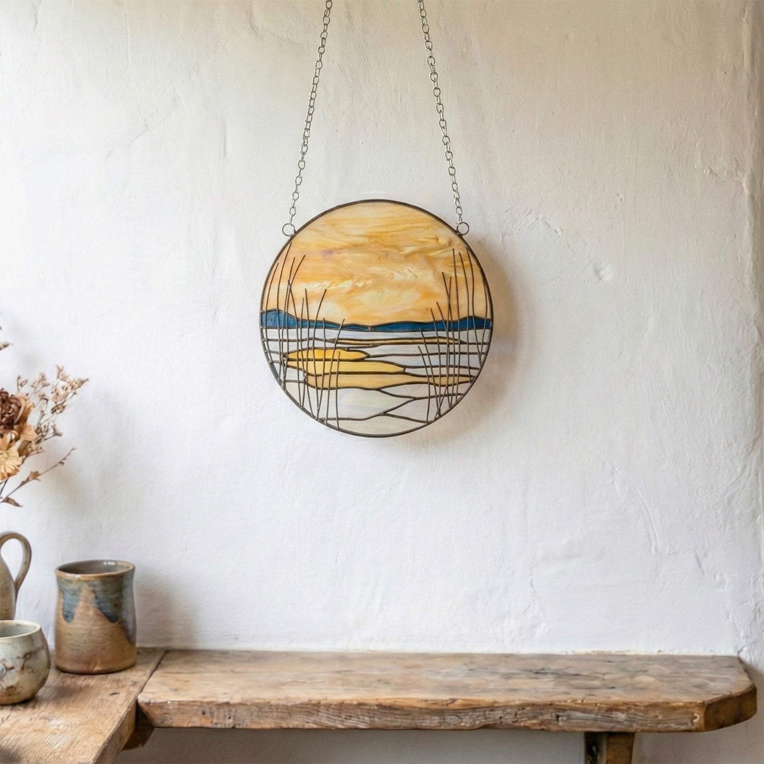 This icy winter marsh landscape stained glass pattern is a digital stain glass pattern for a winter scape or sunet vista landscape light catcher. This mountain suncatcher stained glass PDF download is printable, delivered instantly and prints out on 11x17" tabloid paper. It requires tinned copper wire to complete the "reeds" soldered on the design. Many more details are below!